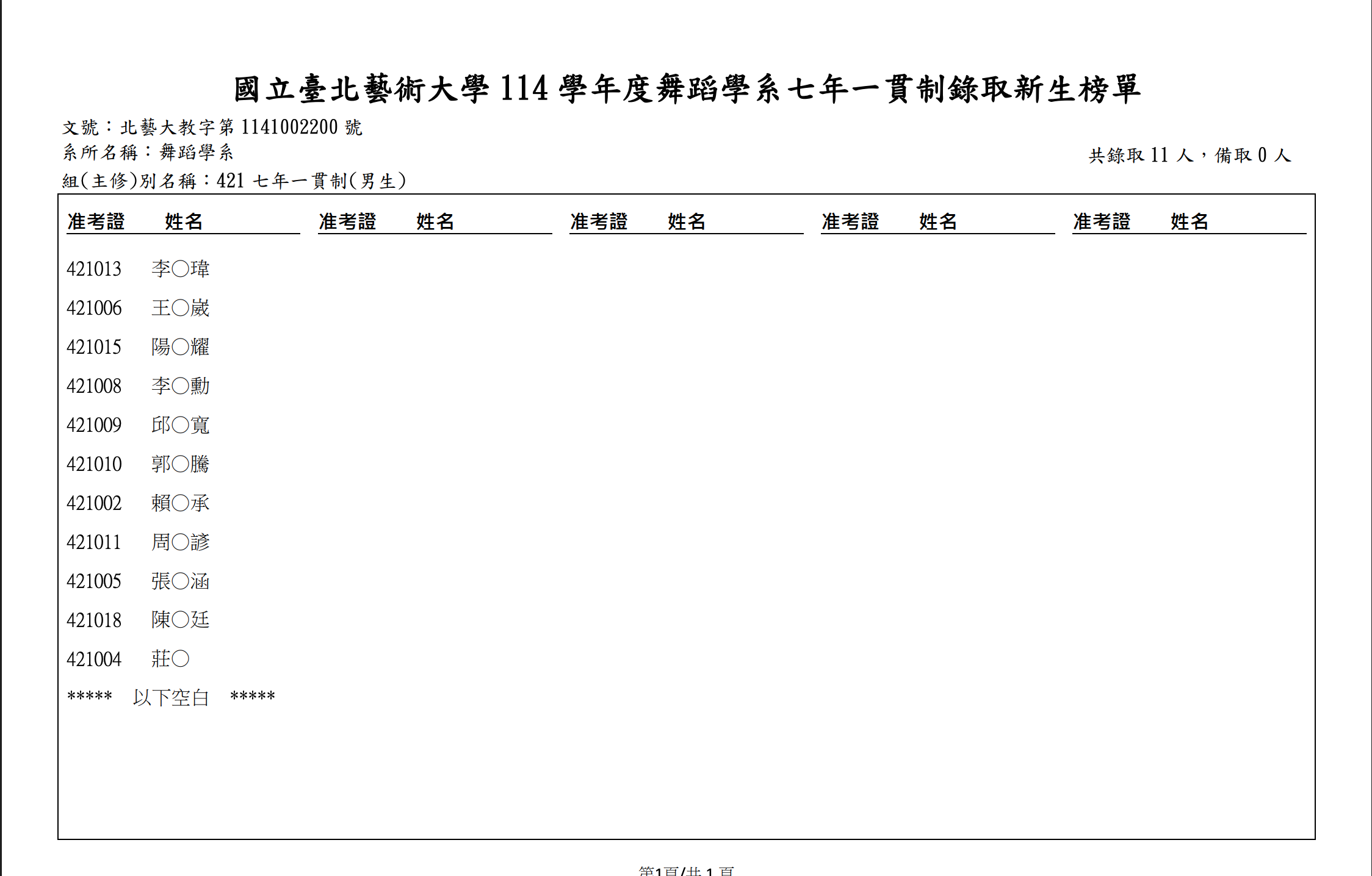 114學年度舞蹈學系七年一貫制新生錄取公告
