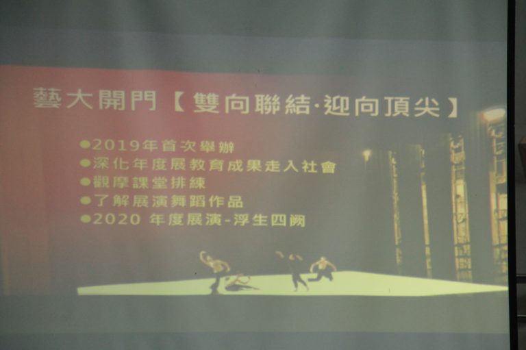 校方於今年啟動「藝術推廣─藝大開門」計畫,與舞蹈學院中長程目標一致。如何鞏固與深化年度展演教育成果走入社會,並持續領航國際舞蹈教學,需要在深耕細作與開創佈局上擘畫。因此,本院特規劃2019年執行【雙向聯結‧迎向頂尖】專案。